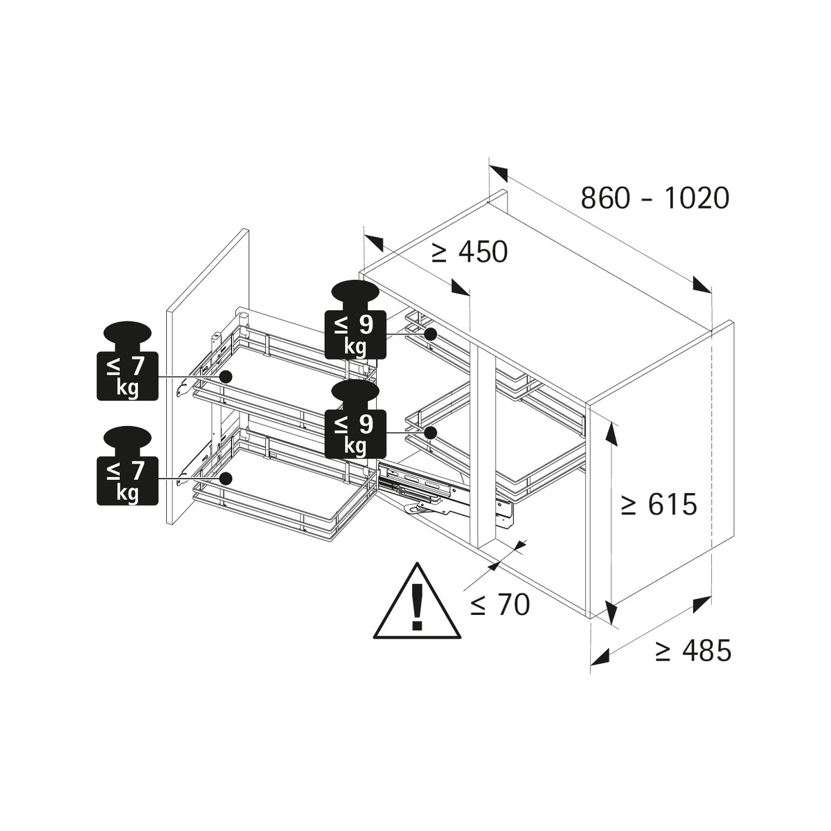 - Load capacity 7 kg per front pull-out shelf, 9 kg per rear pull-out shelf