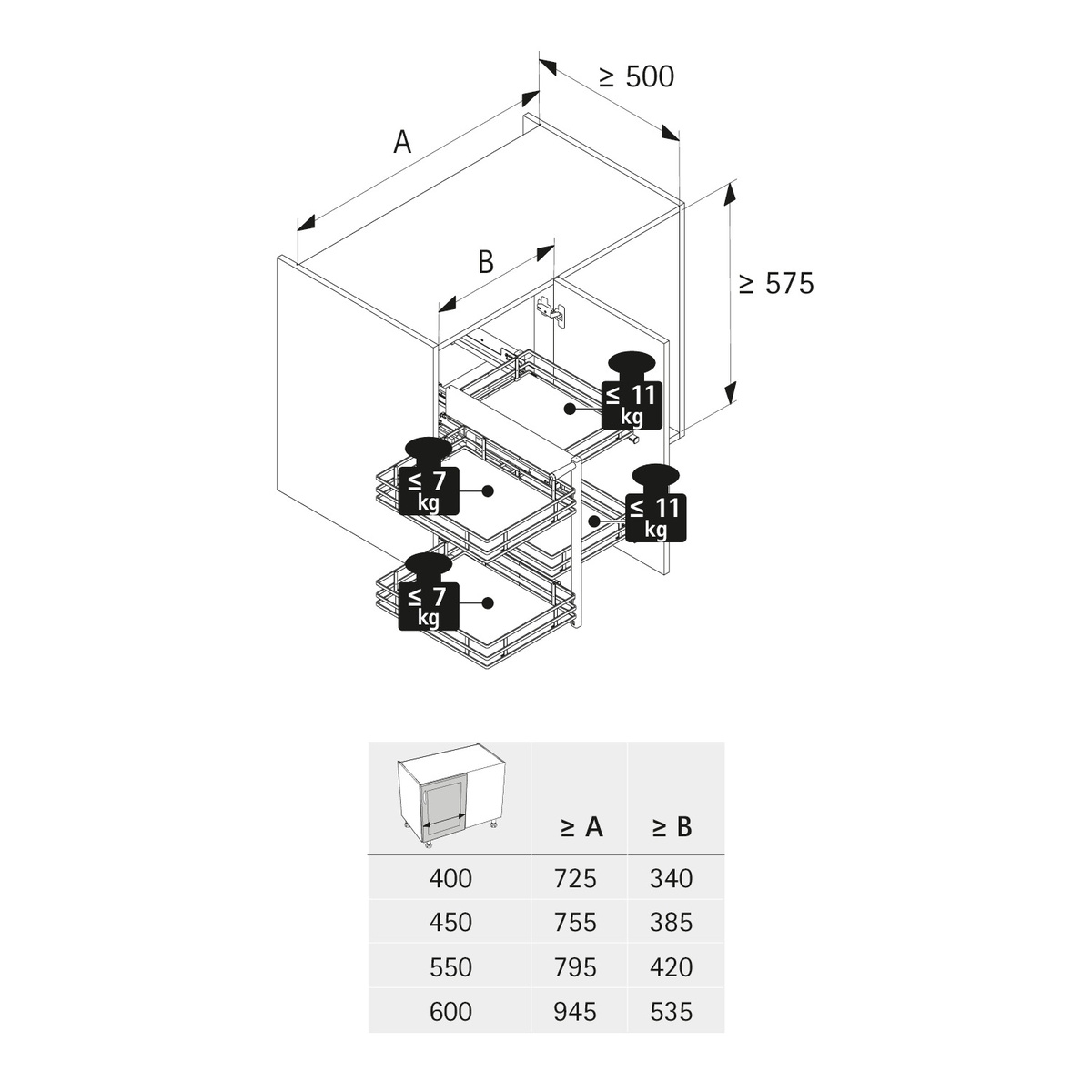 - Load capacity 7 kg per front pull-out shelf, 11 kg per rear pull-out shelf